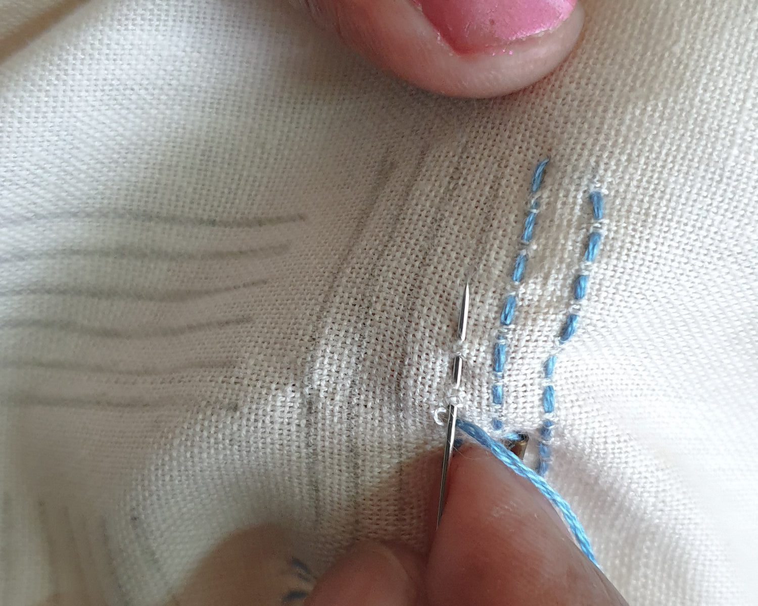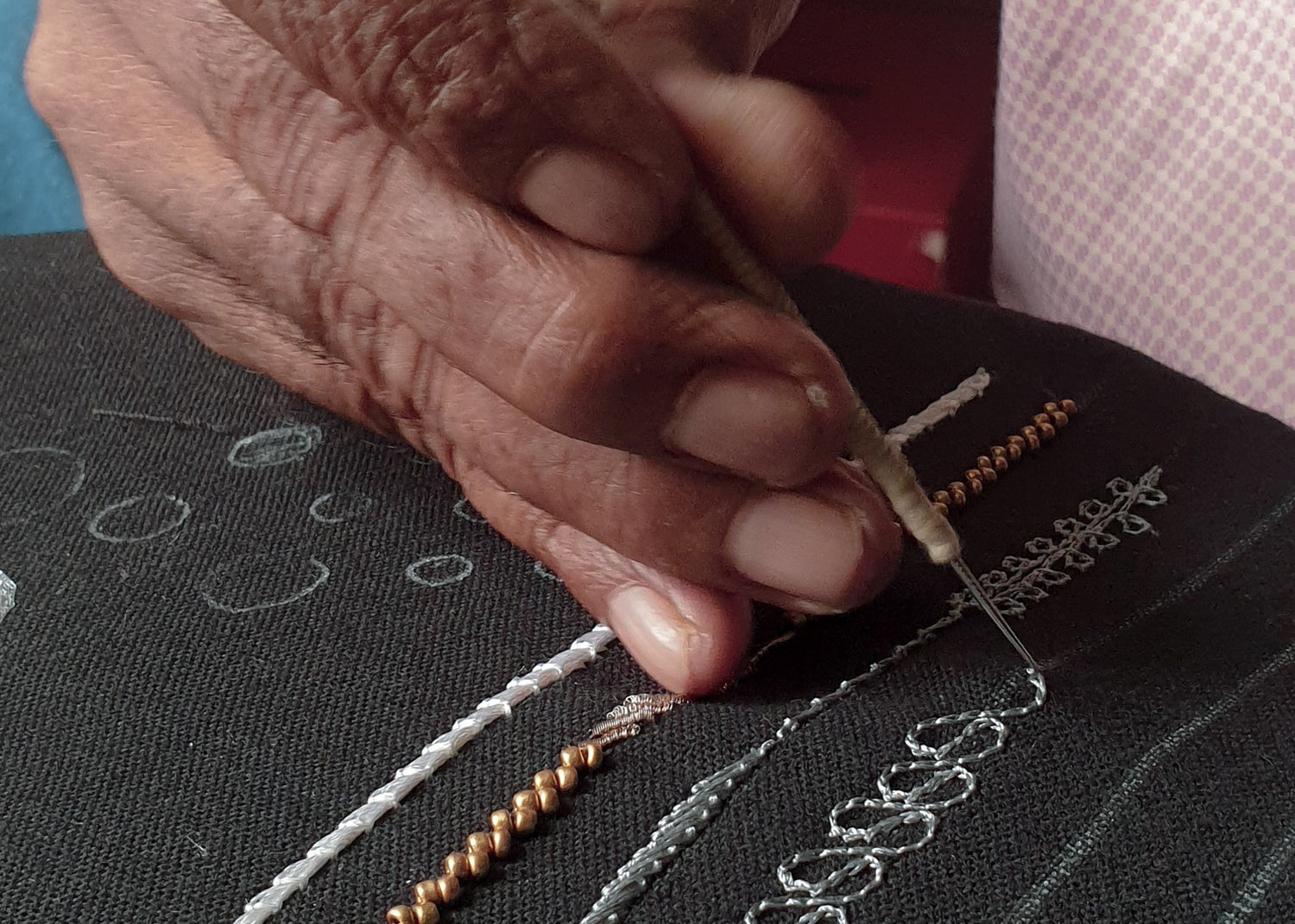 Free hand embroidery is embroidery done without the use of any supporting wooden frame. The artisan would first trace the pattern onto the fabric, and then begin with the embroidery process. Since a wooden frame is not used, the stitches are done with the utmost dedication to careful detail and precision.