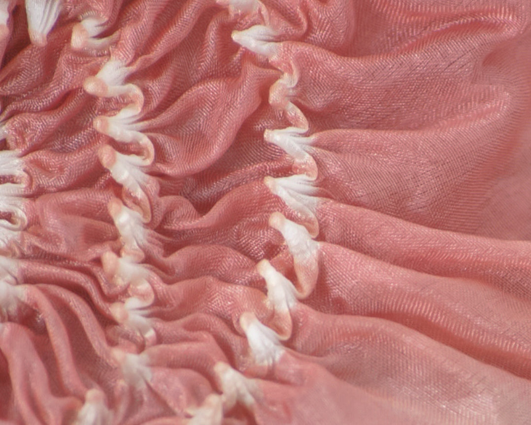 The process involves carefully measuring and creating a pattern onto the fabric at first. Then, nimble hands (usually done by women), gather and tie the fabric into small knots. The cloth then goes for dyeing. The knots do not catch colour. Once the cloth is dried, the knots are opened, revealing the pattern created, alongwith the signature pinched texture.